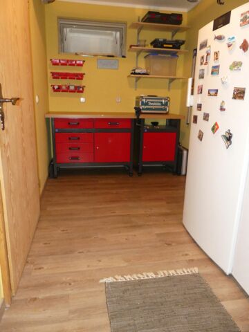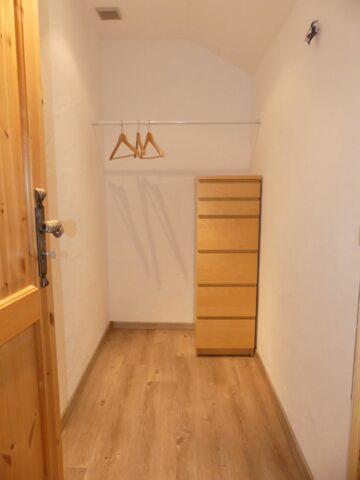 Aus einer ehemaligen Saunadusche wurde mit wenig Aufwand ein kleiner begehbarer Kleiderschrank für ein Kinderzimmer.
